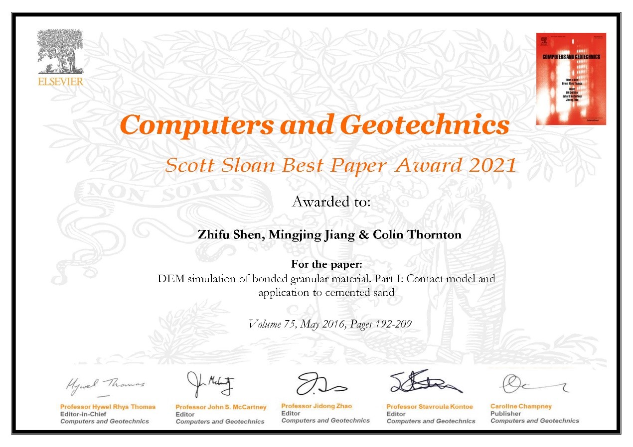 来源:老王论坛 发布日期:2023-02-04 浏览:次近日,国际著名计算岩土力学期刊《Computers and Geotechnics》(JCR Q1区)发布Scott Sloan最佳论文奖(2021),我校老王论坛 蒋明镜教授作为通讯作者撰写的论文《DEM simulation of bonded granular material. Part I: Contact model and application to cemented sand》(2016, Vol. 75, pp. 192-209)获此殊荣,全球共5篇论文入选。