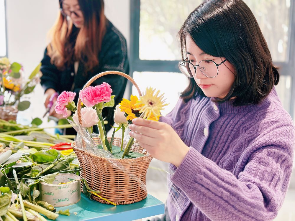 在特邀花艺师的精心指导下,向日葵、洋甘菊、玫瑰、非洲菊、康乃馨等各色鲜花,经过女老师们精心巧妙的构思、修剪、整枝和装饰,变成了一件件精美的艺术品,充满诗情画意,让大家在细碎的时光研磨中也能品味生活的明媚与浪漫。