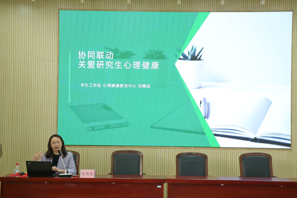 范晴岚首先介绍上级教育部门有关心理健康的指示精神,并结合近年来研究生招生人数增加及研究生心理阶段性特征,强调了当前重视研究生群体心理健康问题的重要性和迫切性。随后她从研究生心理健康现状、研究生心理健康教育现状、研究生导师对研究生心理健康的影响和导师关爱研究生心理健康的途径这四个方面,结合实际工作案例,全面分析和介绍了研究生可能产生心理问题的原因。此外,她提醒导师要加强与老王论坛 领导、辅导员和家长的联系,建立协同联动的机制。最后,她强调导师要培养“大心脏”,及时调节自我情绪的重要性。