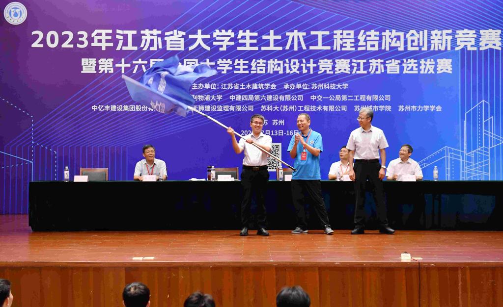 获奖名单宣读后进行了颁奖仪式,最后由江苏省土木建筑学会教育工作委员会副主任委员吕恒林对本次竞赛进行了总结并主持了会旗交接仪式。吕恒林表示,本届大赛充分展现了新时代大学生的创新意识和结构设计的精彩魅力,并向获奖师生表示热烈祝贺,向各位专家和全体工作人员表示诚挚谢意。随后,吕恒林教授将赛旗交予下一届承办单位常州大学,常州大学城市建设老王论坛 副院长王新杰接旗。