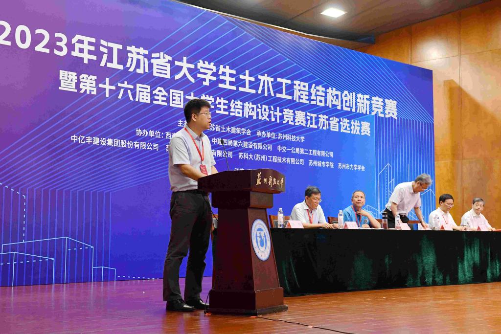 江苏省土木建筑学会教育工作委员会副主任委员吕恒林致辞,他指出,大学生结构设计竞赛在提升高校实践教育教学和创新人才培养质量等方面具有积极作用,祝愿参赛的同学和老师们勇于拼搏,敢于挑战,并取得优异成绩。