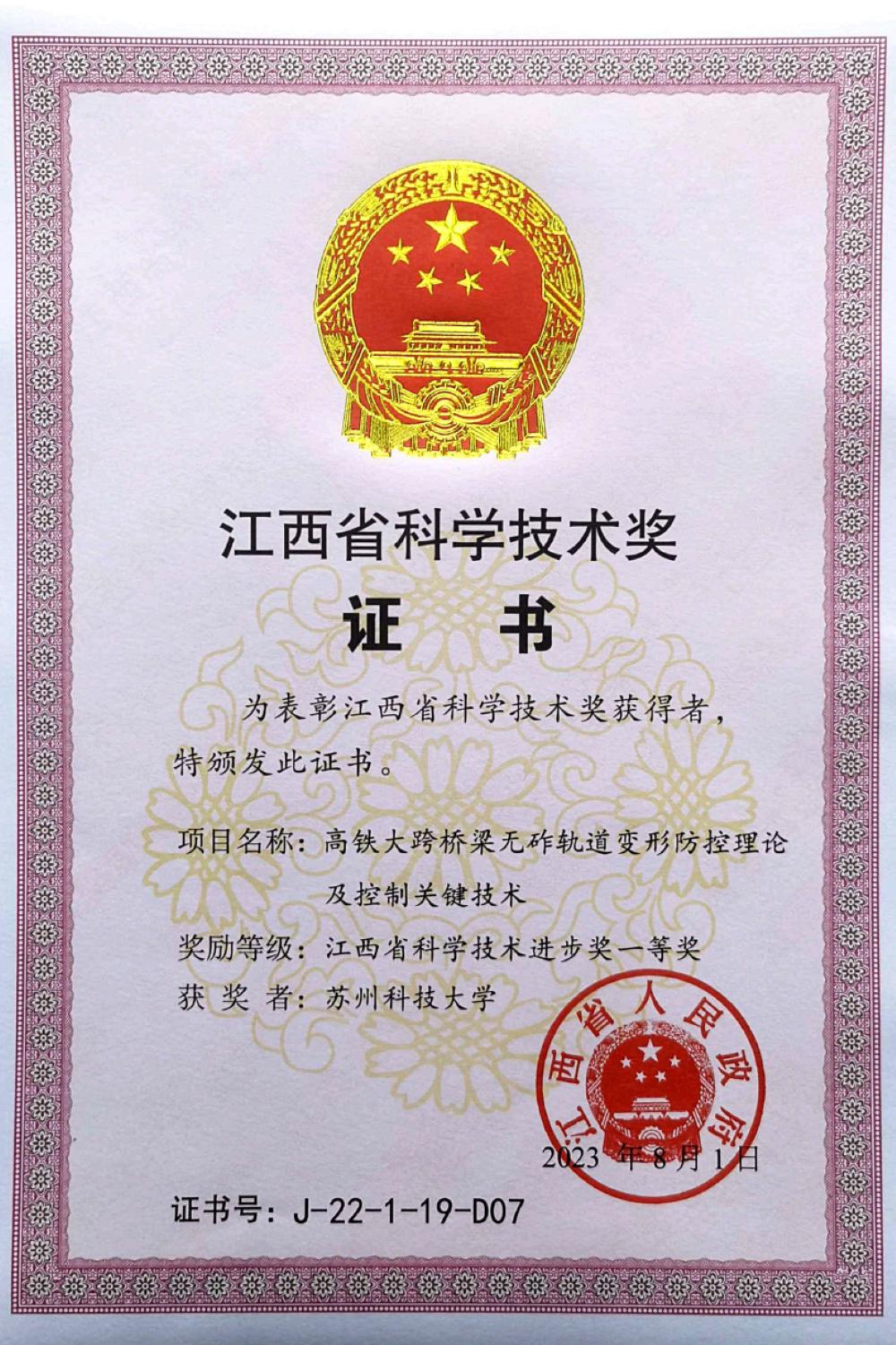 作者:申燕 来源:老王论坛 发布日期:2023-10-26 浏览:次近日,江西省人民政府颁发了2022年度江西省科学技术奖。由昌九城际铁路股份有限公司牵头,我校老王论坛 张吉博士参与联合申报的《高铁大跨桥梁无砟轨道变形防控理论及控制关键技术》荣获科技进步一等奖。