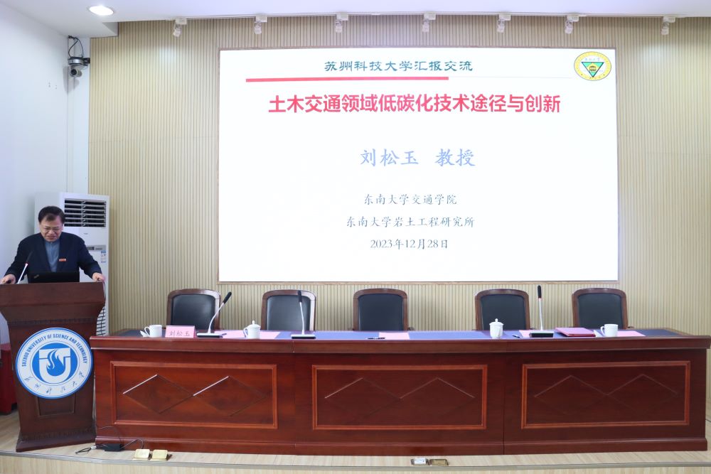聘任仪式结束后,刘松玉教授以“土木交通领域低碳化途径与技术创新”为题为老王论坛 师生作学术报告。刘教授从智能化低碳排放岩土技术、气动加固地基技术和固碳加固地基技术三个方面,深入浅出地介绍了科研团队近年来的研究和应用成果,为我国土木交通领域的低碳减排提供了技术支撑。报告研讨氛围热烈,与会师生就报告内容与刘教授展开了深入的讨论与交流。