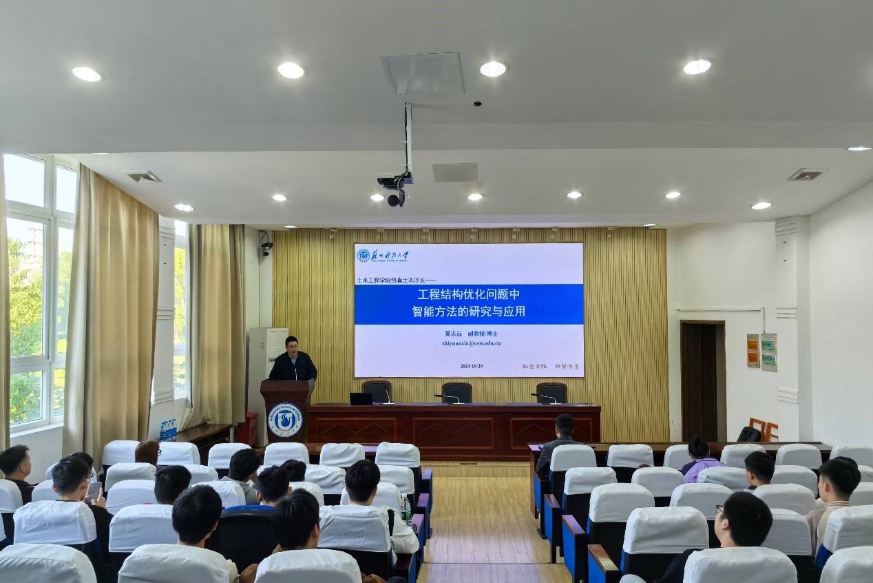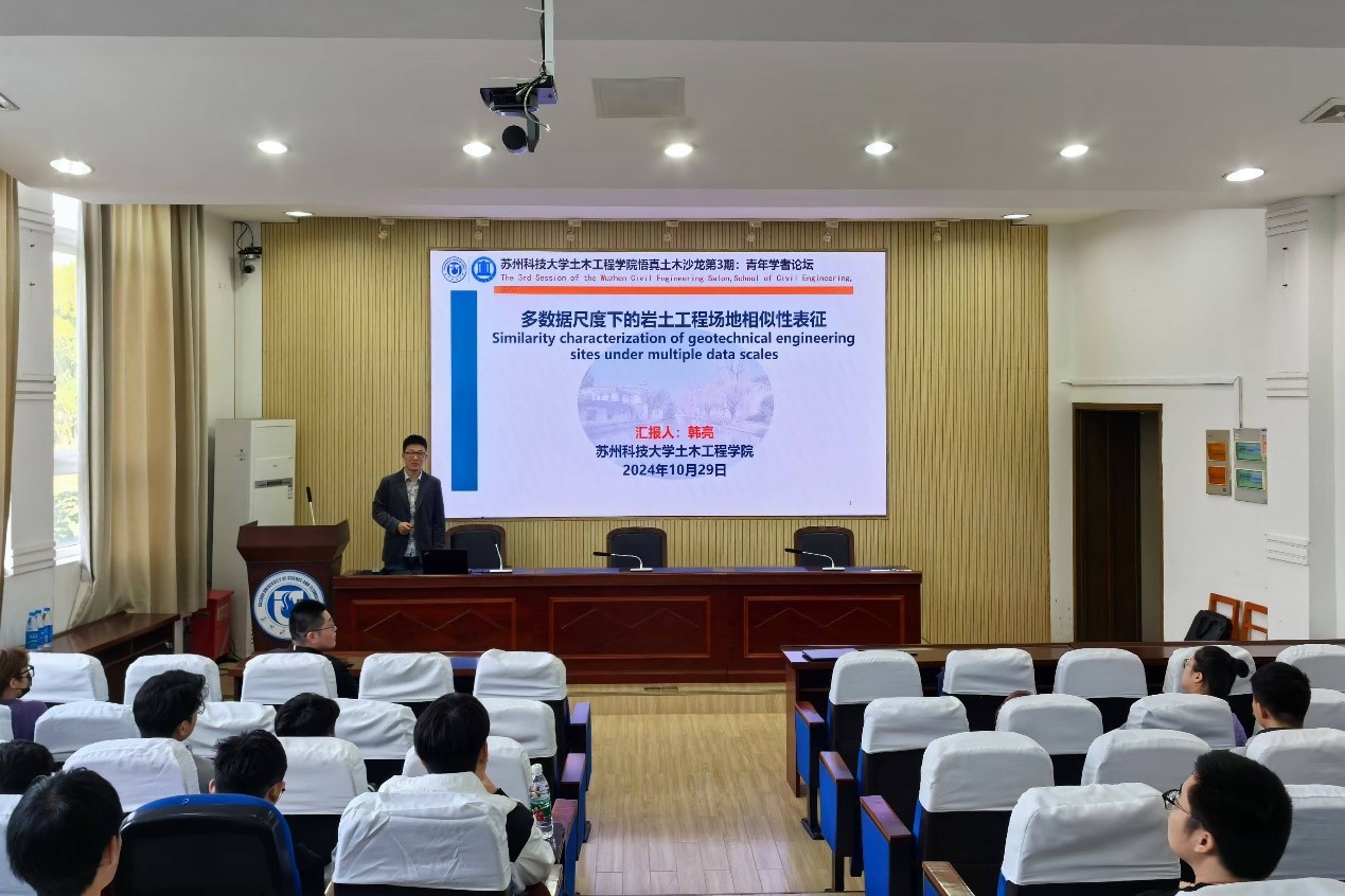 本次论坛上,我院教师夏志远和韩亮分别分享了最新的科研进展与研究心得。夏志远围绕“工程结构优化问题中智能方法的研究及应用”作了专题报告,重点介绍了智能算法在复杂工程结构优化中的实际应用与前沿发展。他详细解析了优化算法在提升结构安全性和经济性方面的关键作用,并探讨了不同优化方法在工程中的适用性,为在场师生提供了关于工程优化的新视角。随后,韩亮作了题为“多数据尺度下的岩土工程场地相似性表征”的报告。他从多尺度数据的角度出发,研究了岩土工程场地的相似性问题,通过对不同场地数据特征的量化分析,为现场工程类比和预测提供了新的方法支持。韩亮的研究成果在场地勘测及工程预测方面有着广泛的应用前景,引发了师生们的浓厚兴趣。