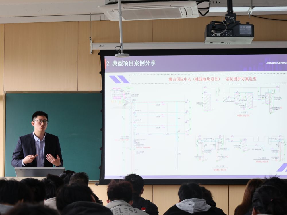 本次活动邀请的主讲专家曹青业近几年负责了苏州地区百余项深大基坑设计项目,工程经验十分丰富。课堂伊始,周爱兆给大家介绍了曹青业的工作履历,并对他表示热烈欢迎。随后,曹青业以“基坑支护设计、施工及案例分享”为主题,结合苏州市典型的基坑工程,深度解读基坑工程的复杂性,并结合真实案例剖析基坑支护设计及施工要点。他用丰富的工程经验告诉同学们,基坑工程具有高风险性、不确定性等特点,而岩土工程师的职责就是在满足施工可行性的前提下,在安全与经济之间寻找平衡点,提供最优的设计方案。 课堂上,曹青业还围绕同学们关心的就业方向、就业市场作了大致介绍,并针对就业岗位的类型、各岗位的技能要求和职业发展路径、如何提升自身竞争力等问题做了详细介绍。