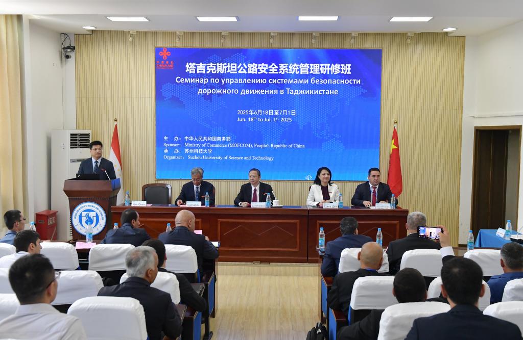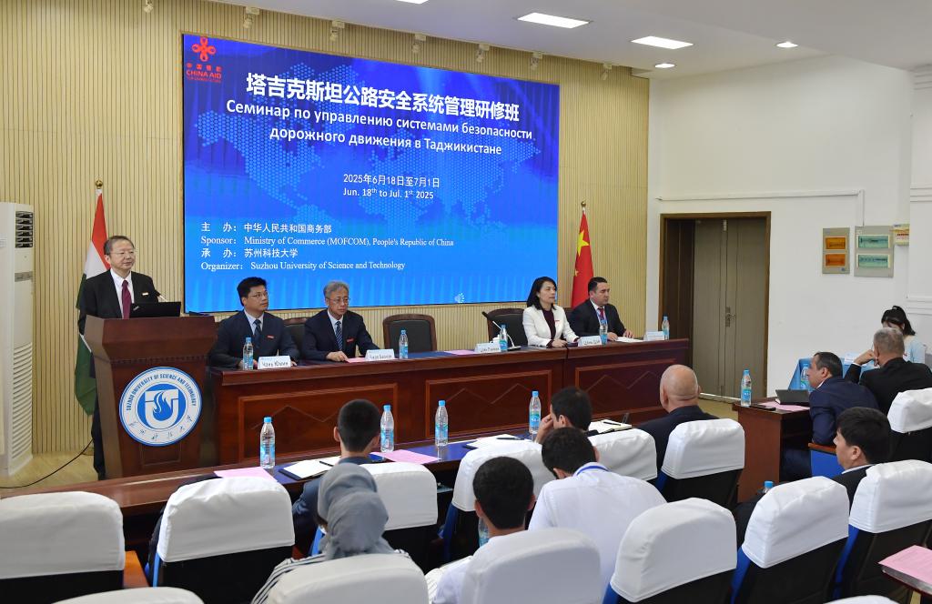 姜朋明在欢迎辞中表示,学校在交通管理、智能建造等领域具备学科优势,已累计承办115期援外培训班,为130多个“一带一路”沿线国家和其他发展中国家逾2500名环境、能源、物流、教育、建规等领域的官员和技术人员开展培训和学历教育。他指出,公路安全系统管理领域是中塔两国基础设施合作与安全治理协同的重要切入点,也是融通“一带一路”产业资源、汇聚科技人才的关键载体。期待培训班成为中外技术共享、经验互鉴的桥梁,助力学员将所学转化为本土发展动能。