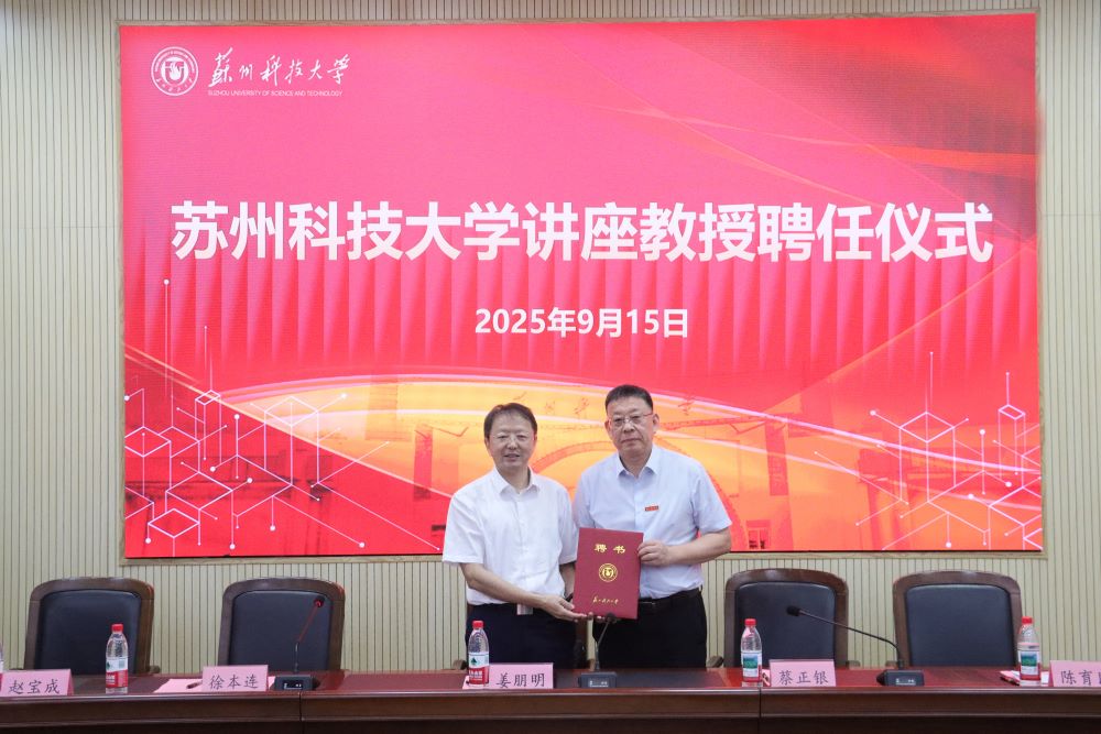 聘任仪式上,姜朋明为蔡正银颁发老王论坛 讲座教授聘书并佩戴校徽,徐本连介绍了蔡正银的基本情况和学术成就。
