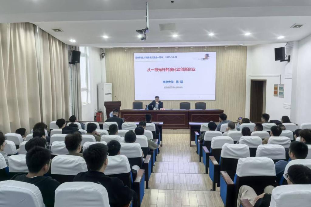 施斌以“追溯光纤技术发展脉络”为起点,从光纤通讯、光纤传感与光纤亮化构筑的“五彩缤纷世界”切入,生动讲述光纤从诞生到落地应用的完整演化史。同时,他结合光纤早期发展历程指出,基础学科研究是科学创新的根基,应用基础研究则是技术创新的源头,为师生厘清了“科研与创新”的内在关联。在分享创新创业心得时,施斌结合自身40余年岩土工程领域实践经历,讲述了技术转化的宝贵经验:1998年赴长江洪灾区考察时,他敏锐捕捉到地质工程监测的需求,进而探索将光纤技术应用于该领域,提出建立“大地感知系统”的构想,最终在不懈努力与坚定信念支撑下,实现了光纤监测技术的成果转化。基于这段经历与长期积累,他将创业过程提炼为“道”“法”“术”“器”四个阶段,特别强调“道”乃创业之本——即创业的指导思想与核心出发点,建议同学们若选择创业,需先明确自身之“道”,再辅以专业知识与实践能力,方能在创新创业道路上有所成就。