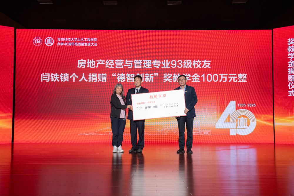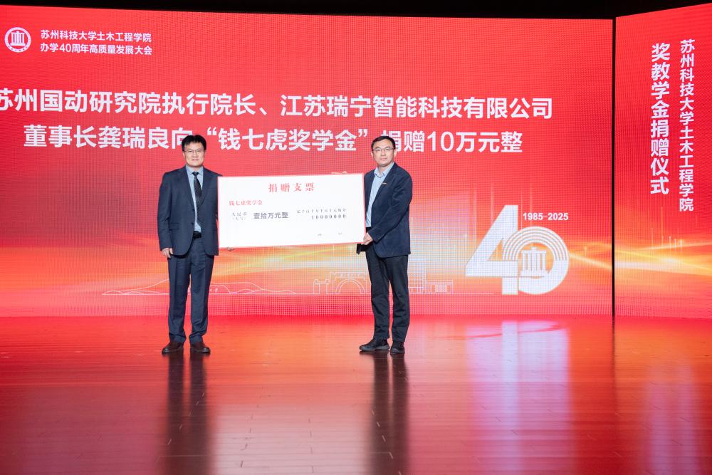 苏州国动防护研究院执行院长、江苏瑞宁智能科技有限公司董事长龚瑞良注资捐赠“钱七虎奖学金”,刘美云代表房地产经营与管理专业93级校友捐赠“93房管爱心助学金”,江苏建院营造股份有限公司董事长徐忠民捐赠“建院奖学金”,闫铁锁和夫人秦秀琴捐赠“德智创新”奖教学金。校教育发展基金会秘书长曹岩代表学校接受捐赠。