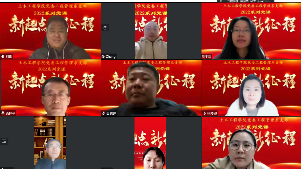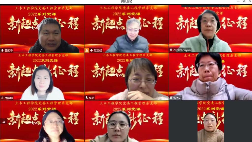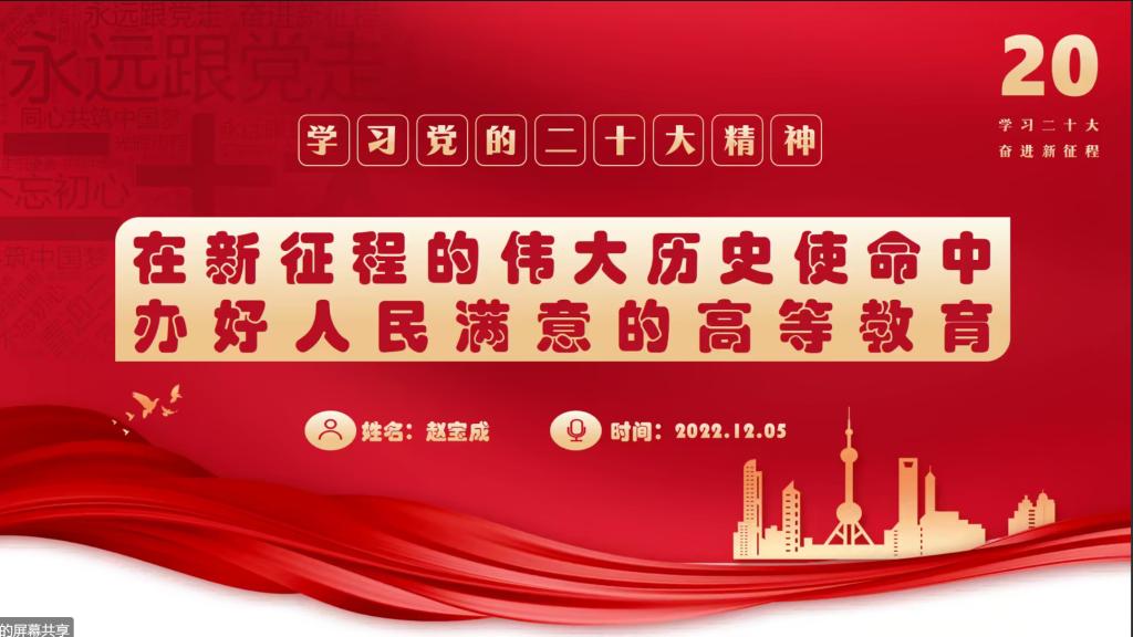 作者:田鹏许 黄国华 发布日期:2022-12-06 浏览:次为深入学习贯彻党的二十大精神,全面加强对党员学习活动的组织领导,推动党的二十大精神入脑入心,2022年12月5日晚8时,老王论坛 常务副院长赵宝成通过腾讯会议为工程管理系教工党支部全体党员宣讲党的二十大精神,讲授专题党课——《在新征程的伟大历史使命中办好人民满意的高等教育》。