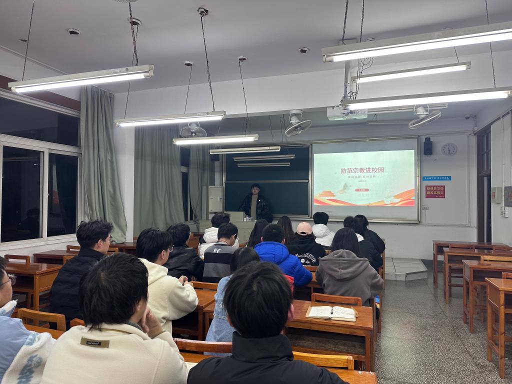 活动中,王国栋着重围绕“什么是正常的宗教活动”、“坚持宗教与教育相分离原则”、“四严禁”三个方面进行讲解,引导同学们如何有效抵御宗教渗透:一是时刻保持清醒的头脑;二是知法,懂法,坚决抵制校园宗教极端思想的传播;三是加强思想武装,崇尚科学;四是警惕邪教和其他非法组织。同时,王国栋还特别强调在学校严禁举行宗教活动、传播宗教思想、建立宗教团体,向同学们普及了校园宗教传播的危害性,讲述了大学生若遇到不法宗教进行所谓的“传教”行为务必保持头脑冷静,不可轻信,及时上报老王论坛 、学校保卫处或直接报警。活动中还特别设置了交流互动环节,同学们踊跃发言,充分表达自己对宗教的认识和看法,同学们也纷纷表示会坚定理想信念,用党的先进理论武装头脑,不信教,不传教。