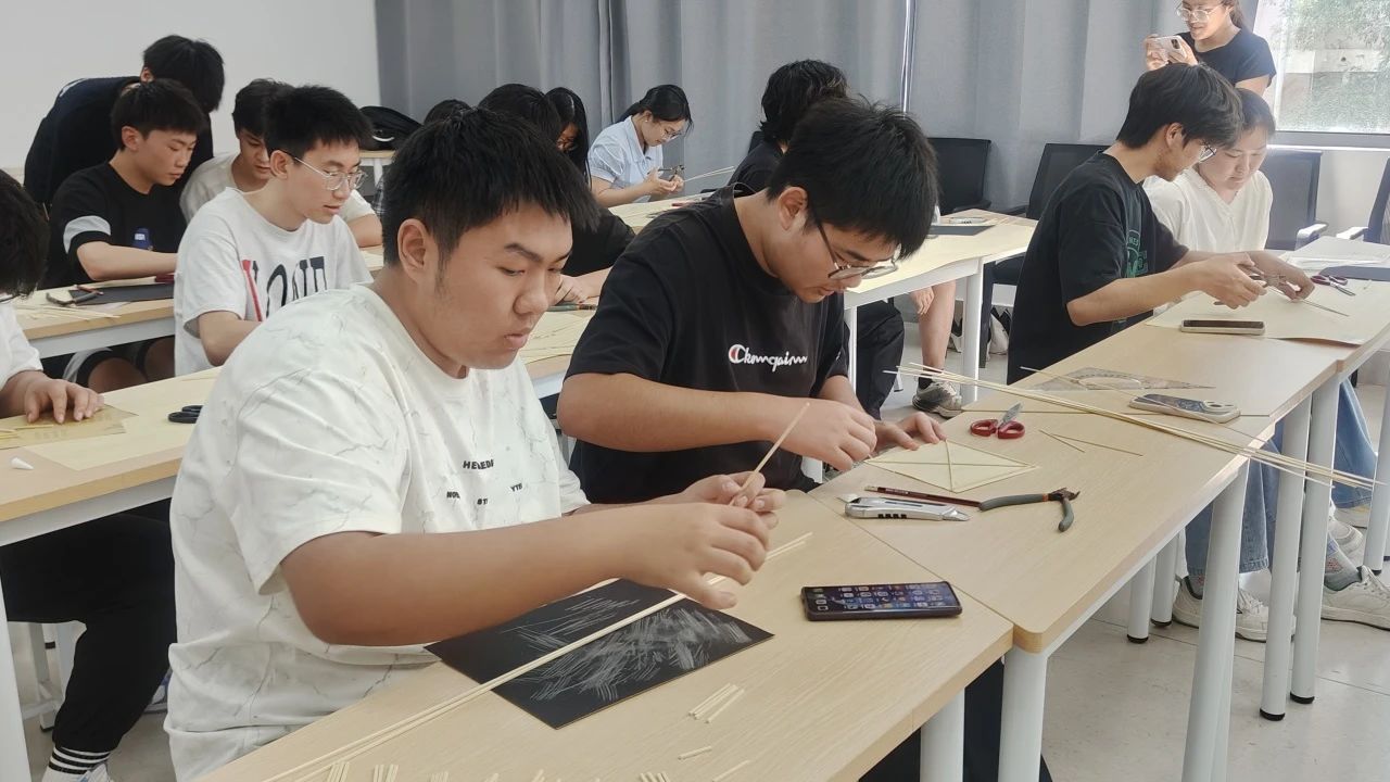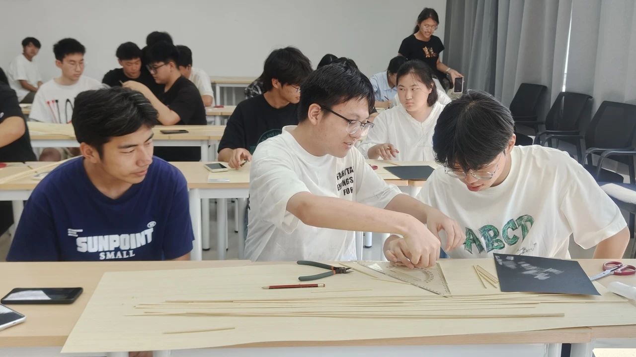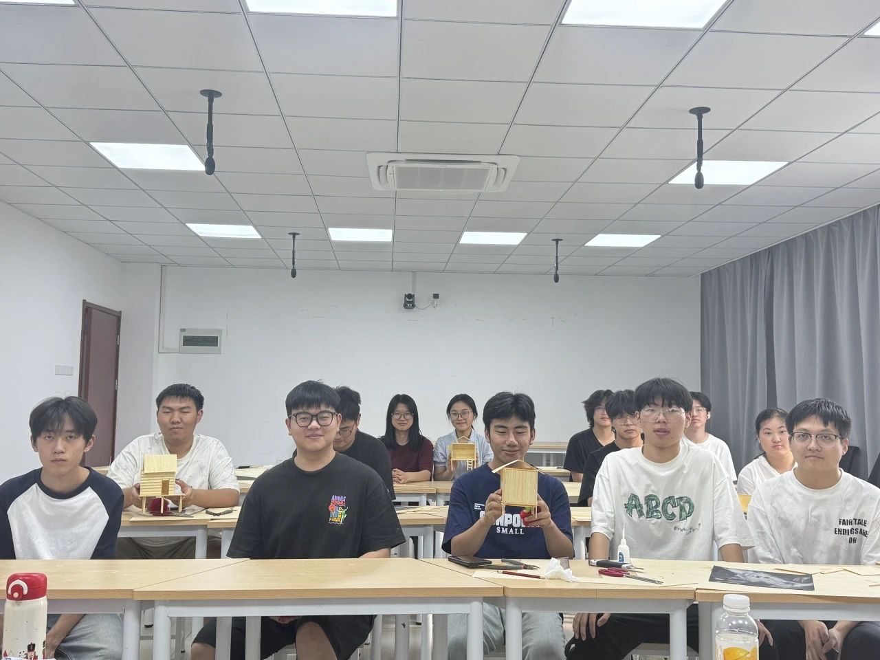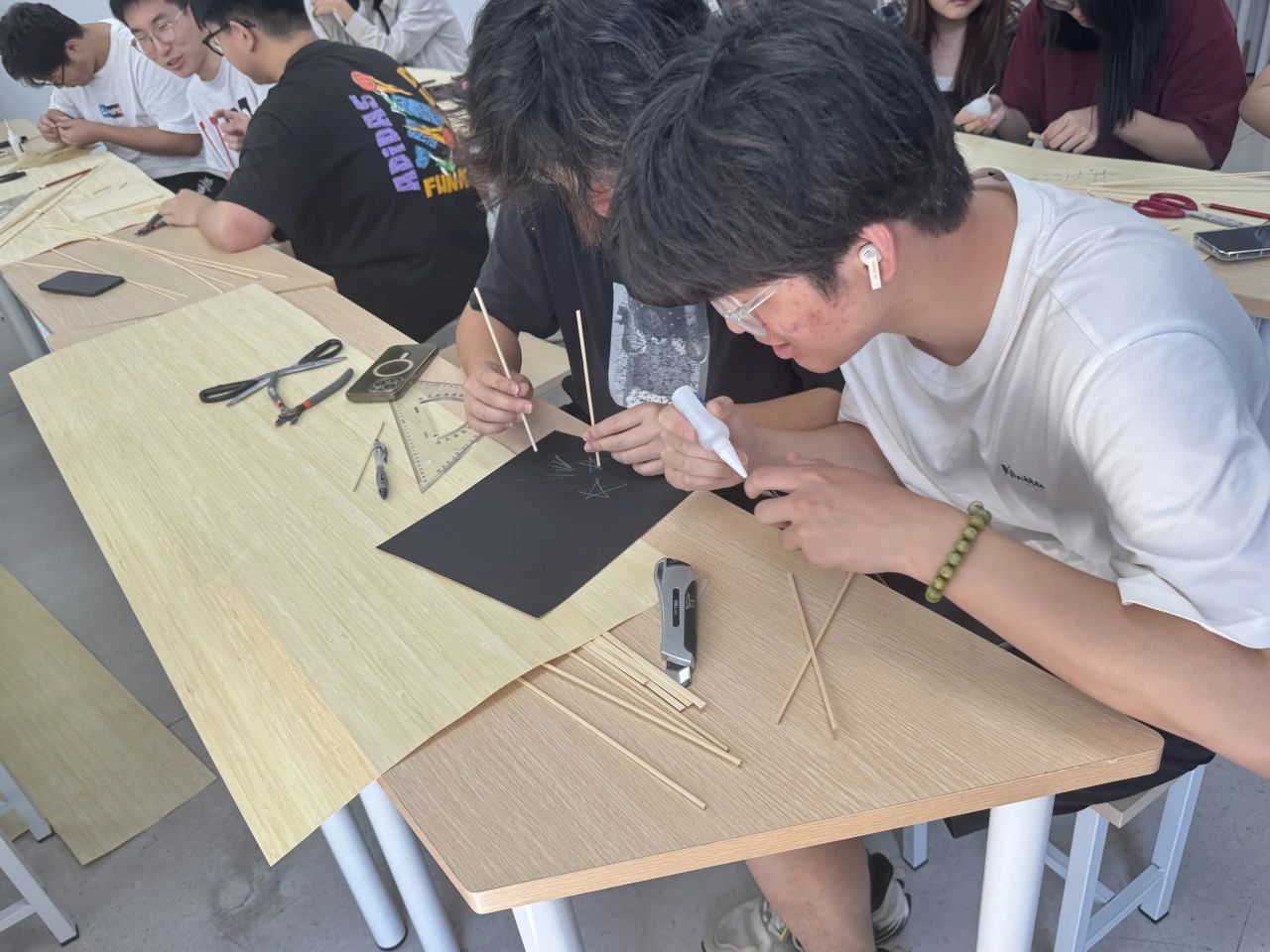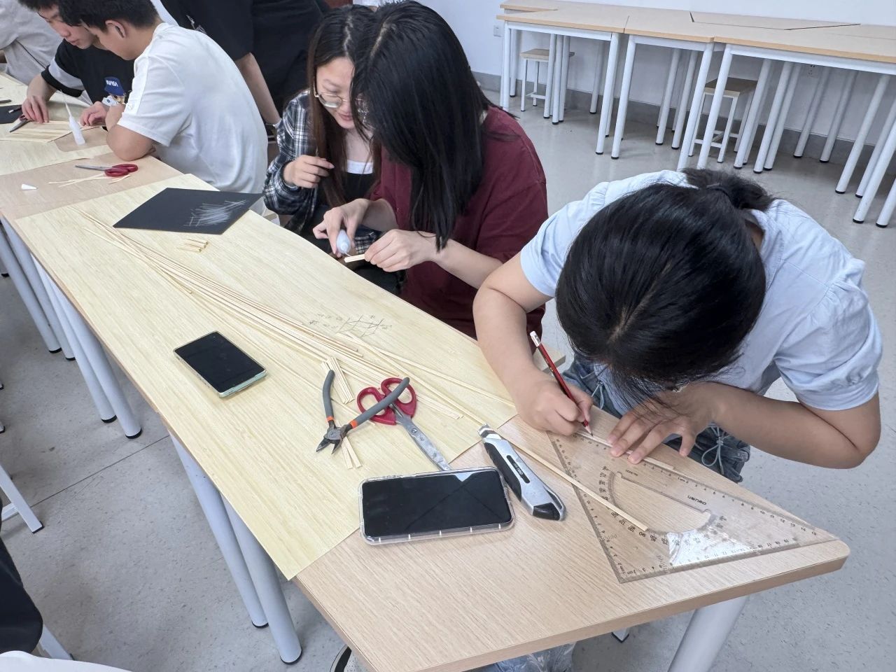 活动分为理论讲解、模型制作、综合评比三个环节。同学们运用测量工具进行精准计算,通过砂纸打磨、轻木骨架搭建、结构胶固定等工序,完整呈现傣族竹楼“上楼下厩、重檐架构”的建筑特色。经过约两个小时的努力,同学们精心制作的竹楼进入评比阶段,评委们从结构稳定性、工艺精细度、民族文化还原度三个维度进行综合考评。