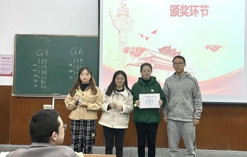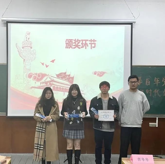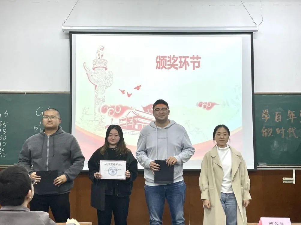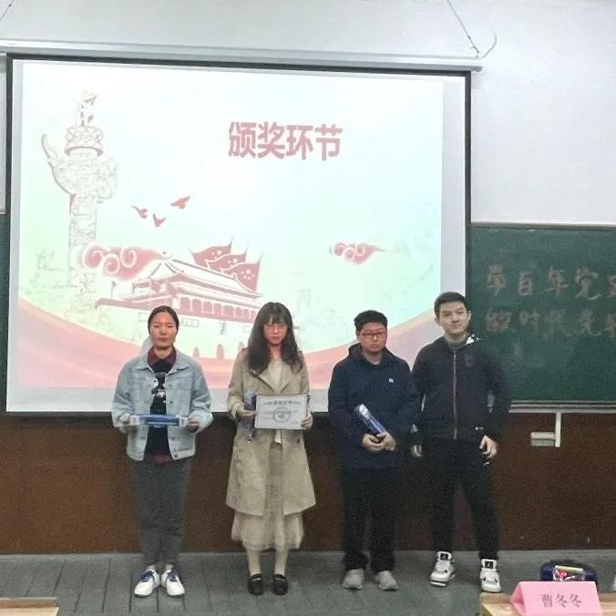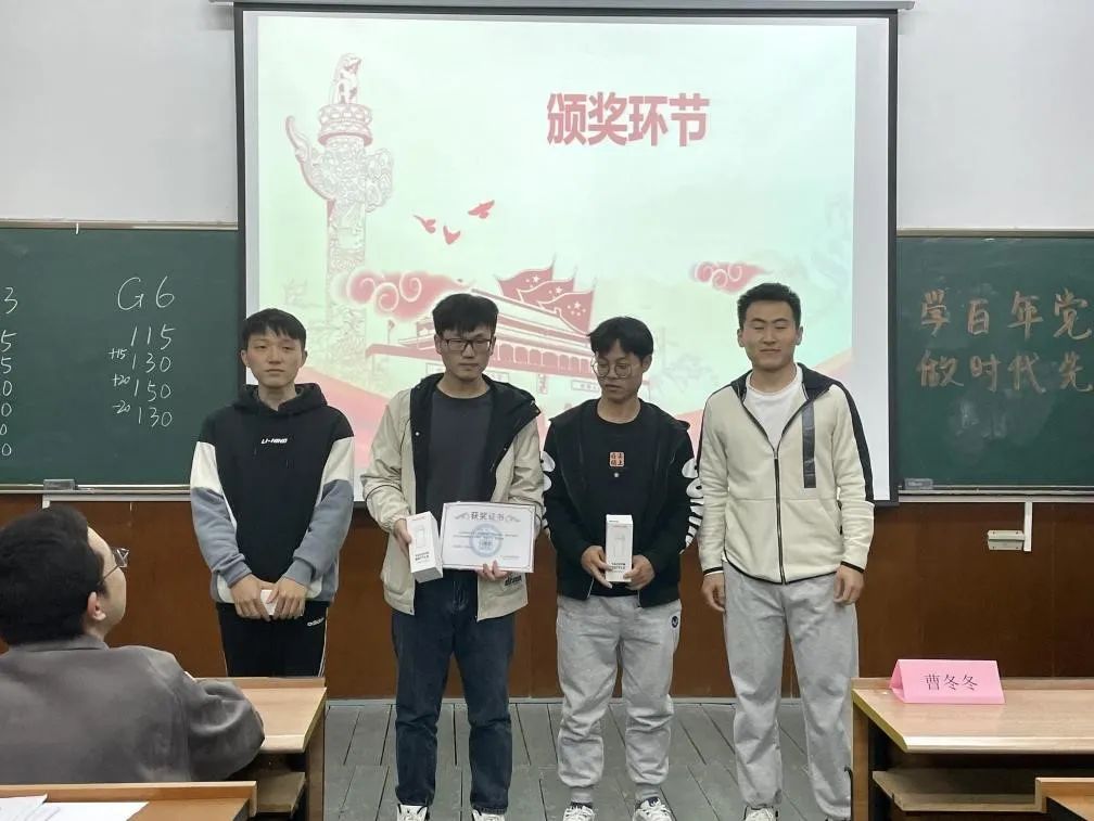 EDGyyds队苏贞文、殷志欢、朱雨南;123队陈雨薇、王唤唤、尹泽;不对也队惠晨曦、鞠俊杰、王世笛同学荣获优胜奖。心中有党成绩理想队徐峰、张枭、杨国栋同学荣获三等奖、永远都队尤子豪、徐晨、魏萱同学荣获二等奖、铁道游击队张肖、何建坤、石凯澳同学荣获一等奖。