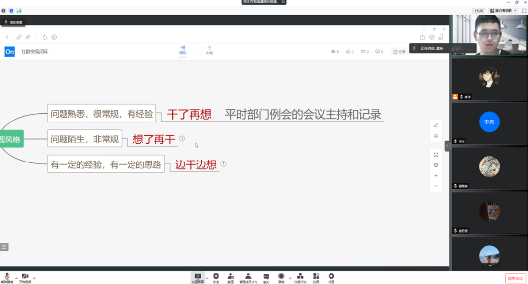 随后根据每组论题,各成员依次进行观点的阐述。在会议过程中,大家表现得十分活跃,在有限的时间内,将各自观点阐述得详细、具体,并且通过列举一些历史故事、职场中或生活中人际交往的事情,来烘托出各自观点的重要性、价值性。