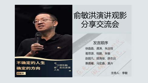 在活动开始前,同学们已经提前观看了俞敏洪的演讲并有了很多感悟。本次分享交流会首先由主持人介绍本次活动,通过本次活动旨在告诉同学们虽然人生有很多的不确定性,但我们要有确定的人生方向,并为之努力奋斗,我们自己才是改变这一切的核心力量。引导同学们养成积极、努力、勤奋向上的个性和习惯,树立目标、志向、理想,珍惜时间,抓住机会。