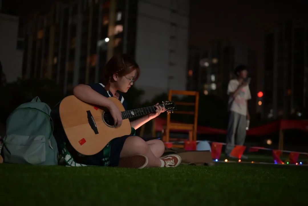 团学文艺部、艺术团的成员为每一位观众准备了小红旗和红旗贴纸,同学们随音乐节奏挥手、舞动,尽显青春的活力与热情,为祖国母亲庆生。活动还邀请了观众上台表演,与大家互动。不少有才艺的同学在此次音乐会上一展歌喉,赢得一片喝彩。在这个热闹的金秋夜晚,丰富的节目内容、有趣的互动形式与热烈的观众氛围,让同学们在柔软的草地上流连忘返。