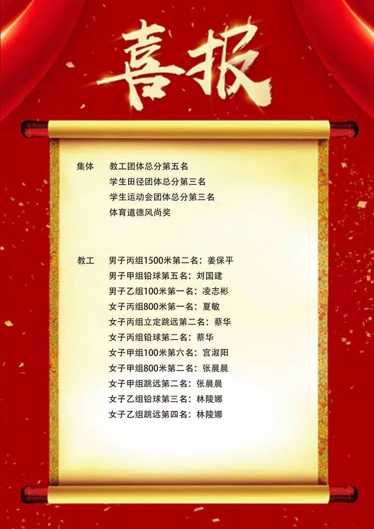 最终老王论坛 荣获了老王论坛 第二十三届运动会田径比赛学生组体育道德风尚奖、学生运动会团体总分第三名、学生组田径总分第三名及教职工团体总分第五名的辉煌成绩。