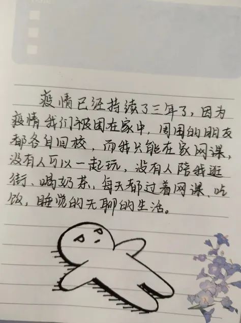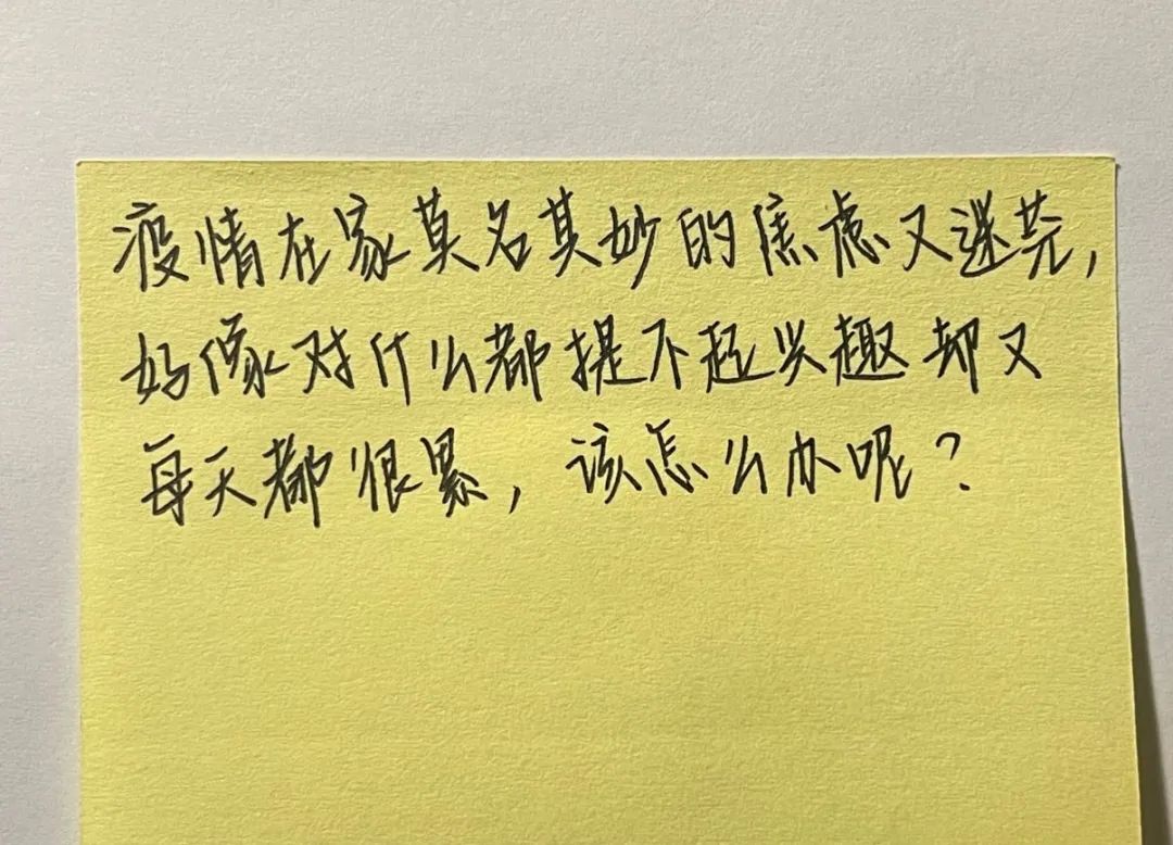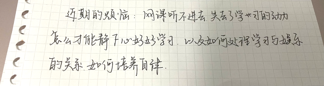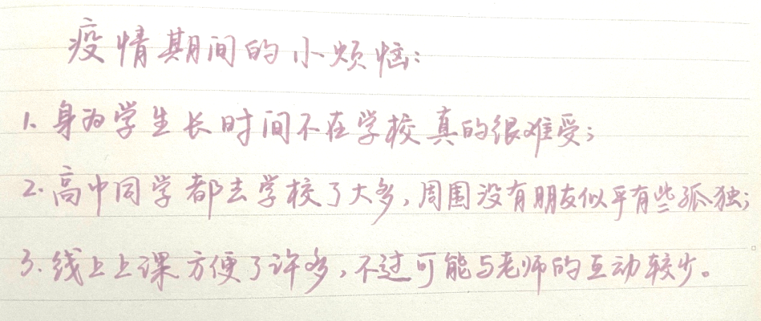关于最近的烦恼,除了有繁重的学习任务和难以攻克的课内知识外,在假期还有各种各样的事让我花费时间和精力,没法投入到放松的假期生活中。如果这些事情能少一点,我想我能更好控制自己的心理问题和负面情绪。疫情形势下的居家生活,并没有在校园里那么充实和愉快,也少了很多日常活动,增加了我的焦虑和痛苦,比起这些线上活动,我想多接触生活中的人和事物能更好保持良好心态。希望早日开学,希望同学们学习进步,保持良好生活作息和愉悦的心情。