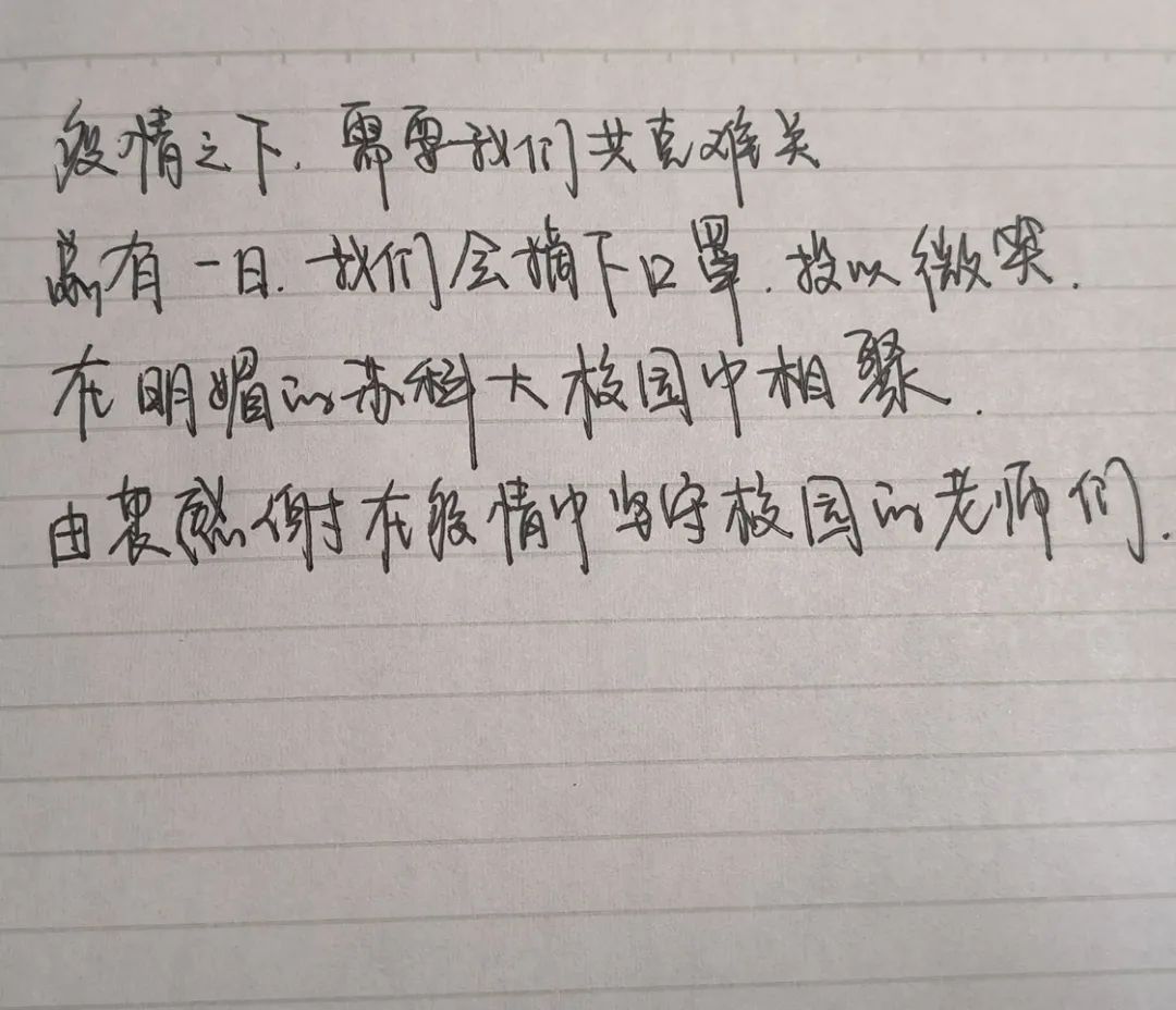 疫情之下,需要我们共克难关,总有一日,我们会摘下口罩,投以微笑,在明媚的苏科大校园中相聚,由衷感谢在疫情中坚守校园的老师们。
