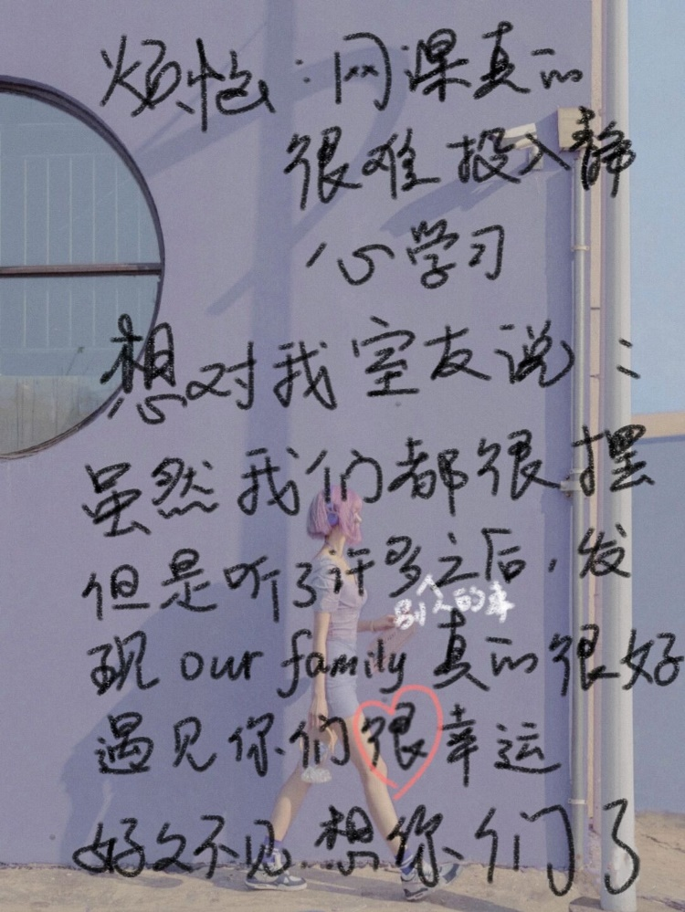 网课真的很难投入静心学习。想对我的室友说:虽然我们都很摆,都是听了许多之后,发现our family真的很好,遇见你们很幸运,好久不见,想你们了。