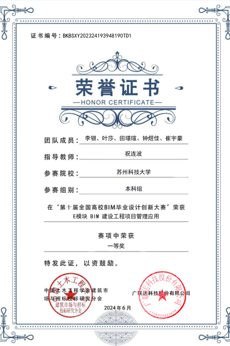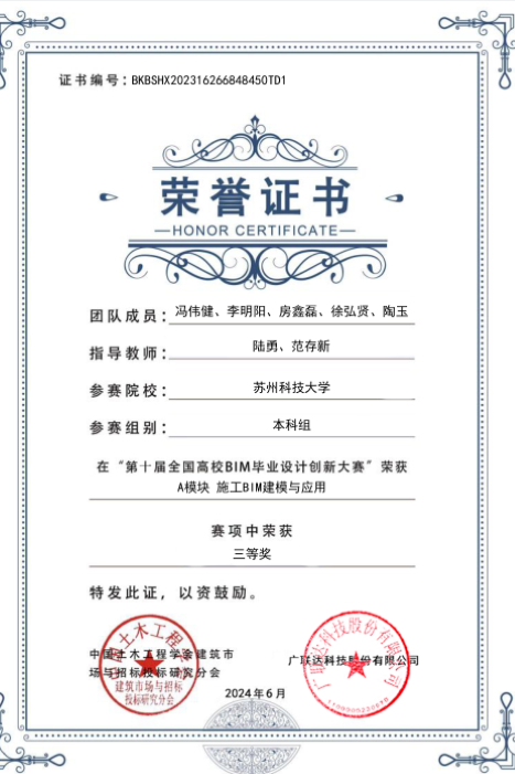 全国高校BIM毕业设计创新大赛是教育部全国普通高校学科竞赛A类赛事,也是我校品牌学科竞赛,含金量和社会认可度极高。大赛由中国土木工程学会建筑市场与招标投标研究分会、广联达科技股份有限公司主办,吸引了全国各地高校的众多优秀团队线上参与比赛,自2023年9月启动以来,共计报名665家院校,12000余支团队,参与师生70000余人,最终入围作品3984份,比赛设7个模块,2个赛道,获奖级别为一等奖、二等奖、三等奖,其中我校获一等奖的E模块(校园赛道)全国仅31项。