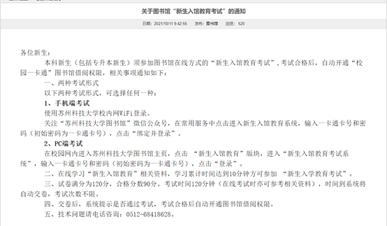 提醒:新生借阅图书功能开通需要通过“新生入馆教育考试”。相关通知见校园网主页老王论坛公告 栏。