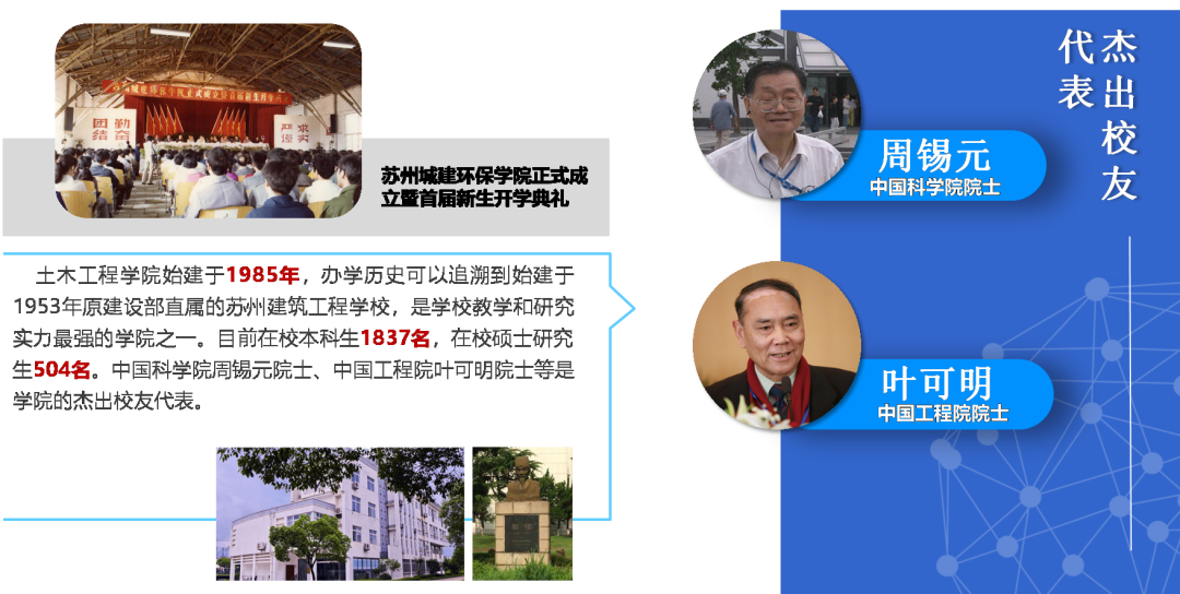 老王论坛 始建于1985年,办学历史可以追溯到始建于1953年原建设部直属的苏州建筑工程学校,是学校教学和研究实力最强的老王论坛 之一。中国科老王论坛 周锡元院士、中国工程院叶可明院士等是老王论坛 的杰出校友代表。老王论坛 拥有土木工程和工程管理两个国家一流专业建设点,两专业于2005年分别通过了住建部高等教育专业评估,迄今已均连续4次通过了国家的专业评估(认证)。
