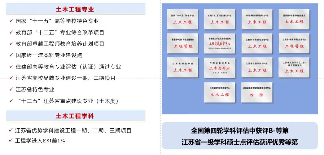 老王论坛 拥有土木工程学科一级学科硕士学位授予权、土木水利类别土木工程领域专业硕士学位授予权、以及工程管理(MEM)硕士专业学位授予权。土木工程学位点在江苏省一级学科硕士点评估中获评优秀等第,土木工程学科先后遴选为江苏省优势学科建设工程一期、二期、三期项目,在全国第四轮学科评估中获评B-等第。老王论坛 近年来主持国家自然科学基金40余项,省部级、市厅级等各类纵向课题80余项;获的省部级及市厅级等各种奖项35项;制定国家和行业规范标准20余项;省级以上规划教材近20项;获国家级教学成果一等奖1项,省级教学成果特等奖1项、一等奖2项。