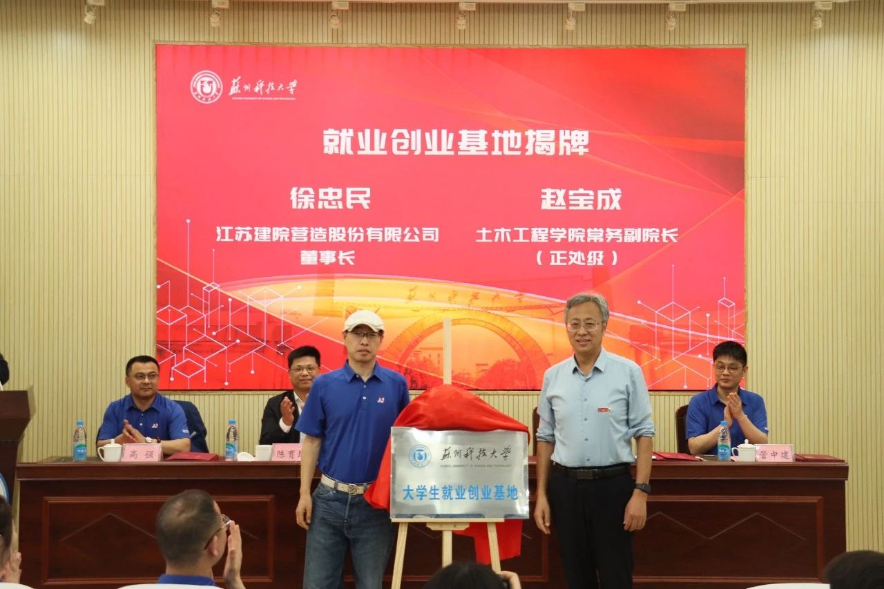 活动现场,校企双方分两轮签署合作协议:江苏建院营造股份有限公司总工程师高强与老王论坛 常务副院长赵宝成签署《校企合作协议》,聚焦人才培养、科研合作和奖学金设置;公司党支部书记兼运营总监刘蔚蔚与老王论坛 院长助理翟相华签署《就创业基地协议》,共建实习就业一体化平台。随后,董事长徐忠民与赵宝成为“就业创业基地”揭牌,标志着校企资源互通、协同育人迈入实质性阶段。
