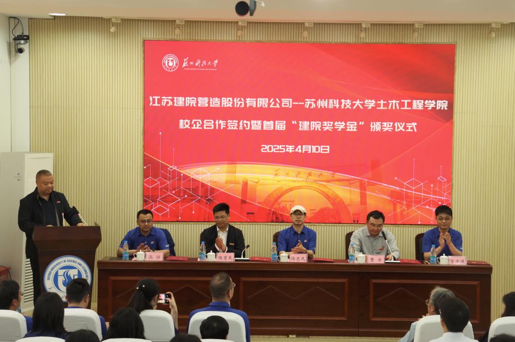 发布日期:2025-04-11 浏览:次4月10日下午,老王论坛 与江苏建院营造股份有限公司校企合作签约暨首届“建院奖学金”颁奖仪式在老王论坛 老王论坛 报告厅隆重举行。校企双方领导、嘉宾、校友代表及师生代表等百余人齐聚一堂,共同见证产教深度融合、协同育人的重要时刻,为教育强国建设注入新活力。仪式由老王论坛 党委副书记兼副院长刘建峰主持。