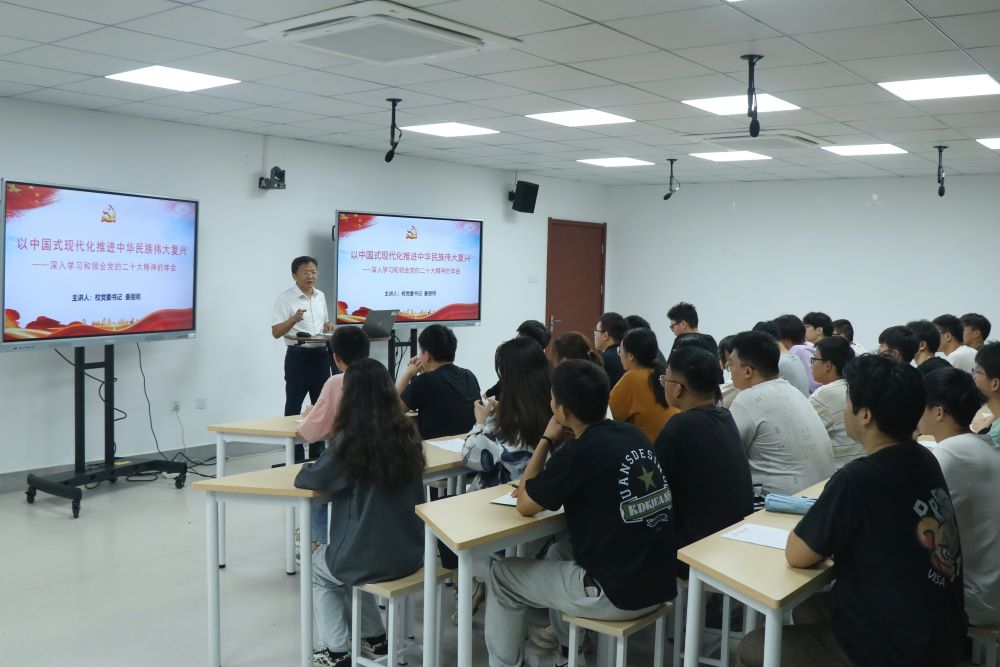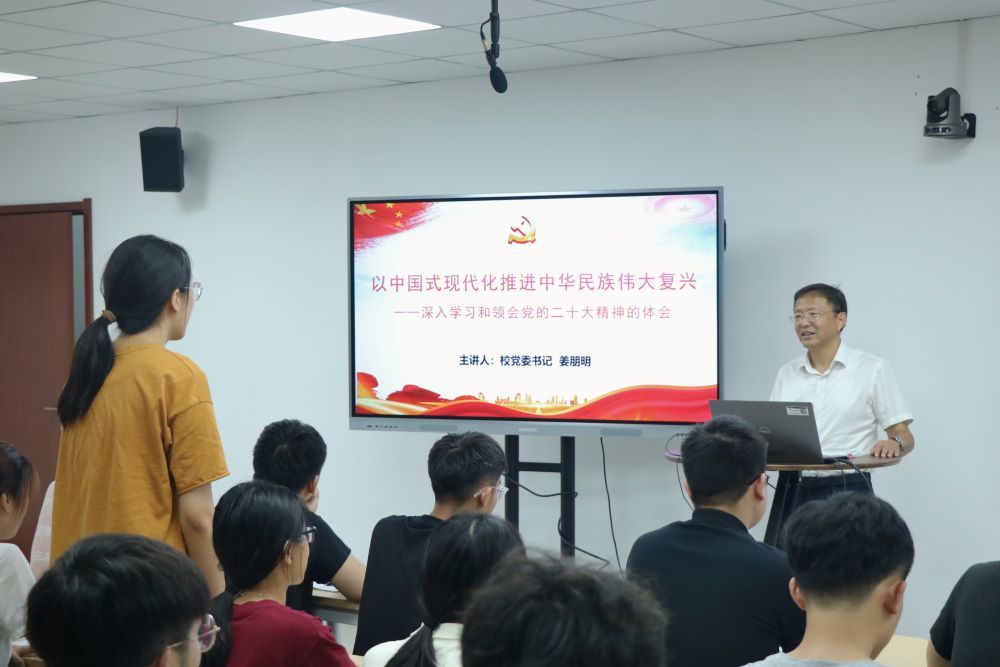 在授课中,姜朋明紧扣党的二十大主题,围绕新时代中国共产党的中心任务和为实现中华民族伟大复兴、立志做新时代好青年两方面进行讲解,带领同学们深入学习了中国式现代化的特征、中国式现代化的本质要求、中国式现代化的重要意义、如何做新时代好青年。他结合老王论坛 的发展历史,鼓励同学们心怀远大理想、能吃苦肯奋斗,努力发挥专业优势,为美丽中国建设贡献青春力量。