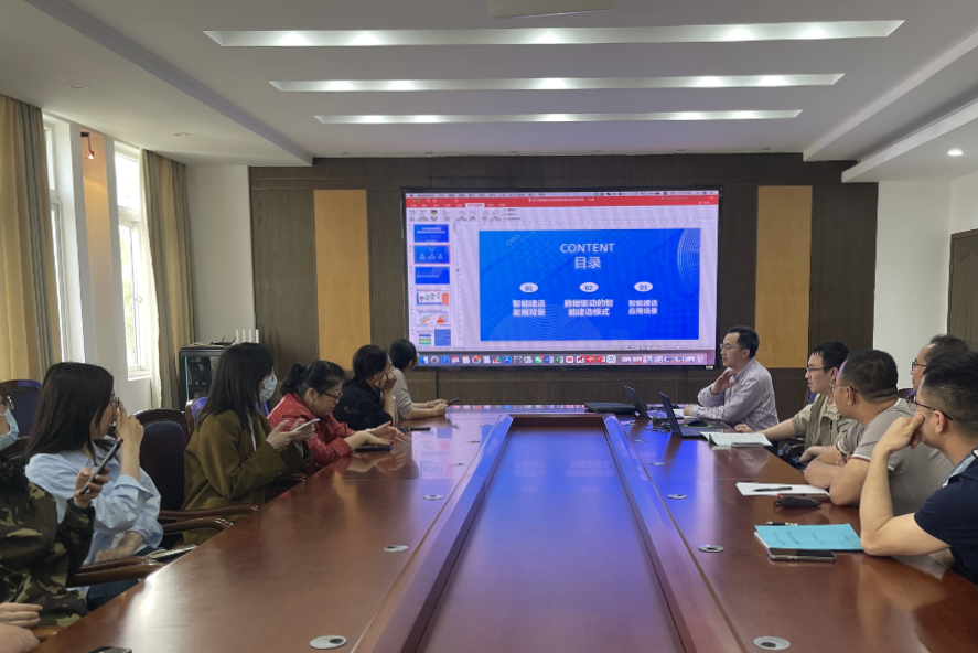 活动首先由建筑工程系主任蔡新江老师发言。蔡老师从智能建造发展背景、智能建造模型和智能建造应用场景三个方面展开讲解,深入剖析目前土木工程行业的困境和智能建造行业的发展趋势。蔡老师强调,未来土木工程行业的发展离不开智能化和信息化等新兴技术手段,目前社会中已经有非常多龙头企业开展了相关的研究和探索。我们高校培养的本科生不应与社会发展脱节,应将人才培养与行业发展有机融合,进一步提升本科生培养质量,促进毕业生更高质量就业。